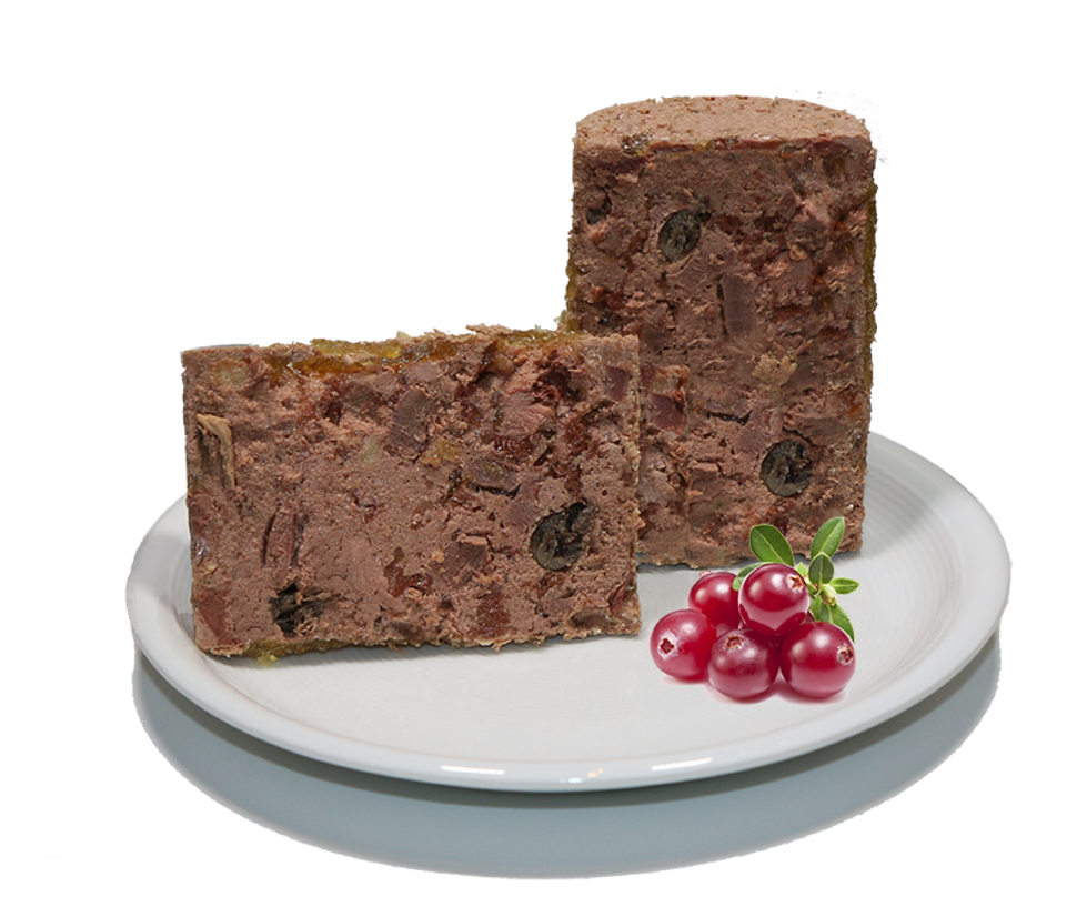 Besonders bekömmliches Geflügelfleisch von Wildente, Pute und Huhn in Lebensmittelqualität, dazu Apfel, Moosbeere und Kamille.